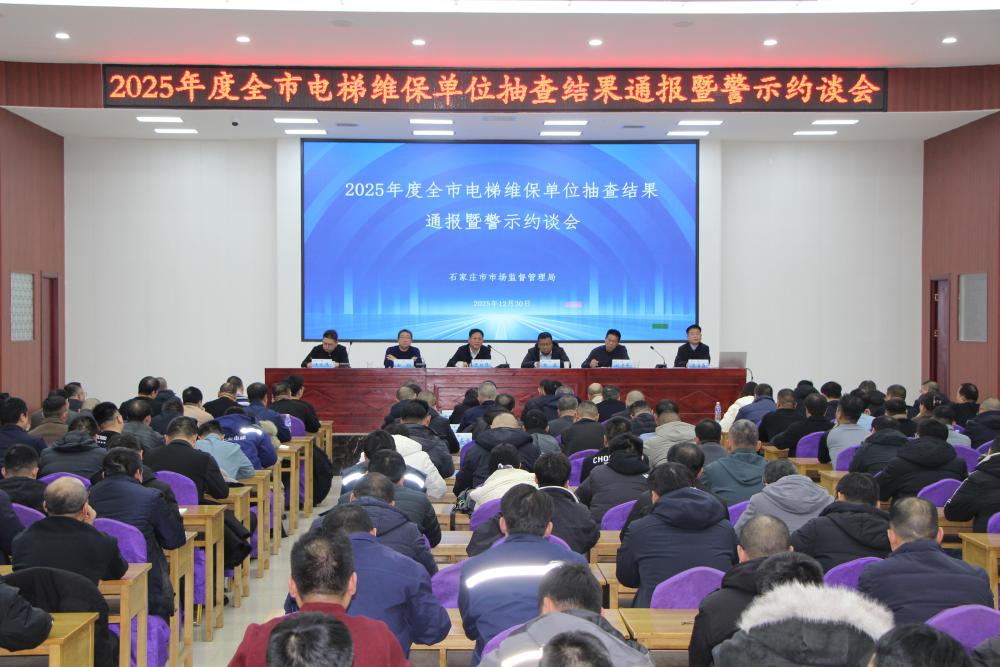 为进一步规范全市电梯维保市场秩序、提升电梯安全保障水平,12月30日,石家庄市市场监督管理局、市特种设备技术检查中心、市特种设备协会联合召开2025年度全市电梯维保单位抽查结果通报暨警示约谈会议。市市场监督管理局贾朝伟二级调研员出席会议,市纪委监委驻局纪检监察组张磊主任到会指导。各县(市、区)市场监管部门业务主管领导、科(股)长,及全市电梯维保单位相关负责人共340余人参加会议。